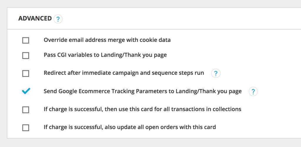 At first glance this makes you feel pretty 🗿 and want to just give up - but - if you scroll down the advance settings a little more you’ll find the option to, “Send Google Ecommerce Tracking Parameters to Landing/Thank you page”: